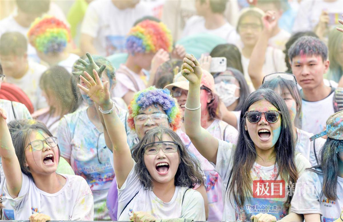 完赛后,毕业生们将手中的彩粉和彩带奋力抛向空中,喷泉广场瞬间成为彩色欢乐的海洋。舞台前,在乐队的伴奏下,毕业生们激情欢歌,绽放青春的喜悦。
