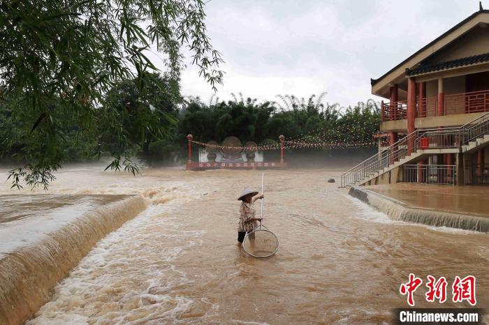 6月14日,一名村民在广西柳州市融安县雅瑶乡章口村西古坡屯洪水中捞鱼虾。谭凯兴摄