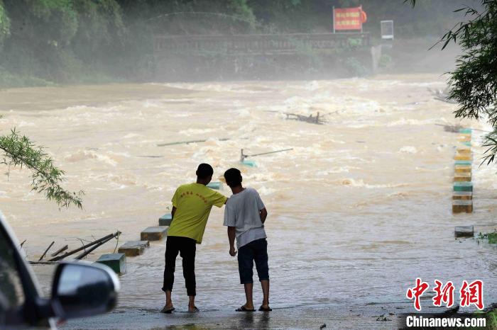 6月14日,村民在广西柳州市融安县大将镇大潭屯桥头,观察水情。谭凯兴摄