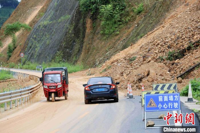 6月14日,工作人员在省道208线柳州市融安县大将镇东阳屯塌方路段设立警示标志牌,提醒过往车辆和人员。谭凯兴摄