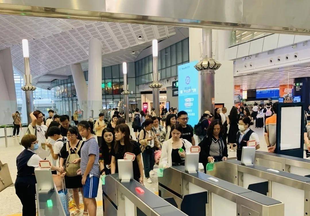 通关后,乘坐首发动卧列车的旅客在车站拍照留念。