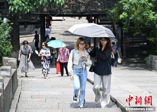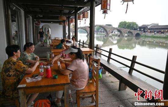 6月14日,广济桥附近,居民在临水亭廊下休闲。