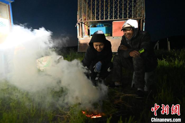 17日晚,内蒙古扎鲁特草原,朝木日力格(左)与男朋友边用牛粪和草驱蚊边谈心。 中新网 记者刘文华摄