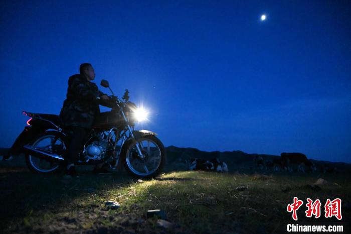 16日晚,内蒙古扎鲁特草原上,牧民达兰台正在默默巡护牛群。 中新网 记者刘文华摄