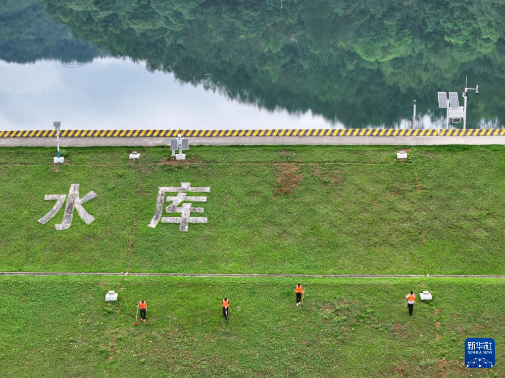 6月18日,在湖南省浏阳市龙伏镇洞庭房水库,工作人员在巡查(无人机照片)。
