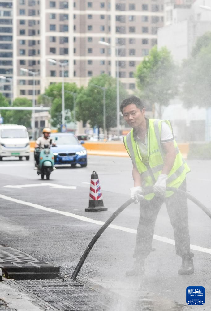 6月18日,在长沙市天心区书院南路,市政设备维护中心工作人员在清理雨水口。
