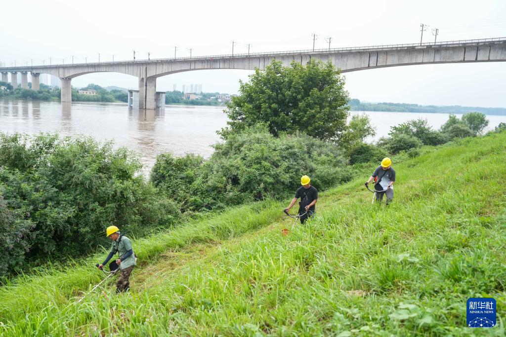 6月18日,长沙市天心区湘江堤岸,南托垸水利管理站工作人员在进行砍青除杂工作,确保河水清畅。