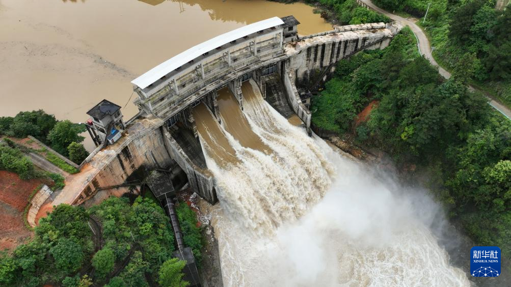 6月18日,位于贵州省黔东南苗族侗族自治州从江县境内的都柳江大融航电枢纽大坝开闸泄洪(无人机照片)。
