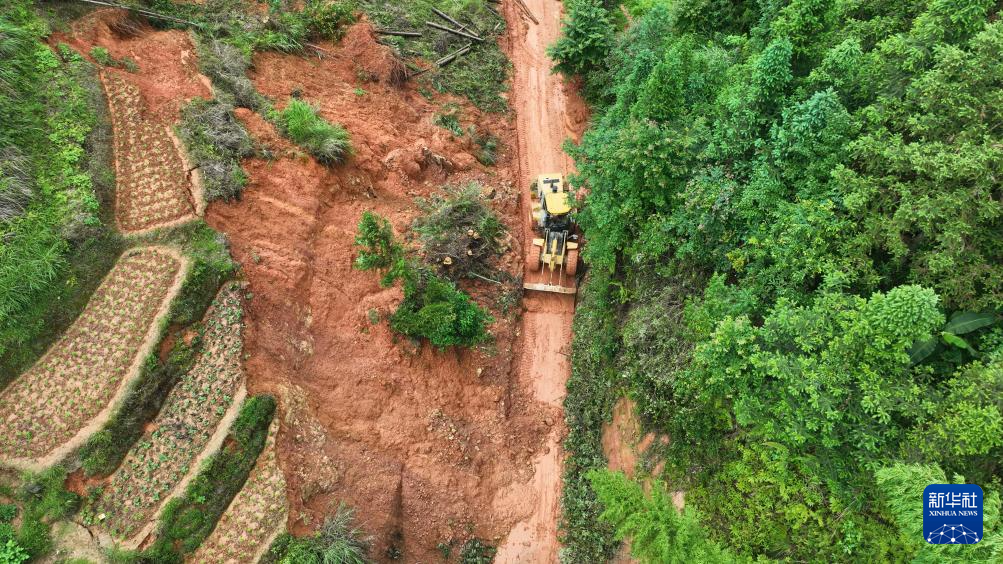 6月18日,工作人员驾驶机械在贵州省黔东南苗族侗族自治州从江县下江镇清理道路(无人机照片)。