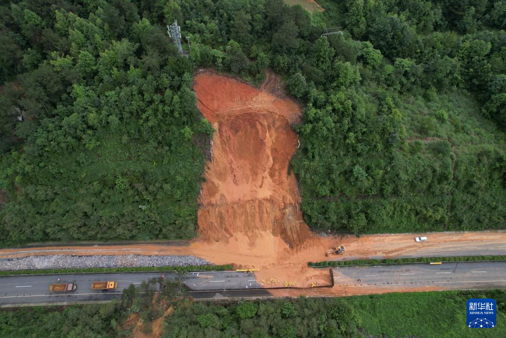 6月18日,在广西融水苗族自治县融水镇新安村,一台推土机在清理塌方路段。