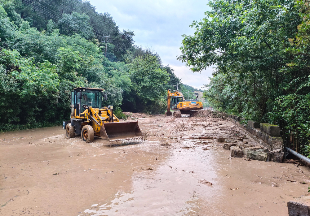 6月20日,在黄山市屯溪区,工作人员清理塌方路段。新华社发(吴丹摄)