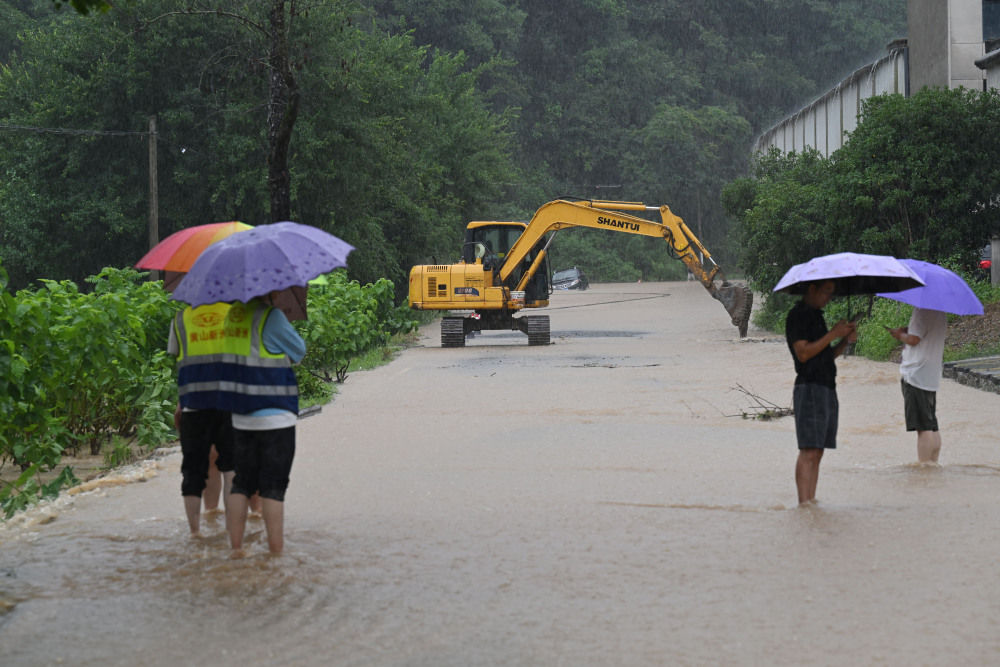 6月20日,在黄山市歙县徽城镇,工作人员用挖掘机阻拦积水道路,防止车辆误入。 新华社记者 周牧 摄