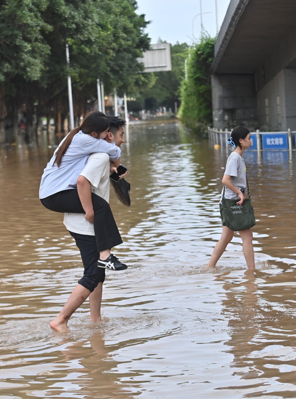6月20日,在桂林市上海路,市民经过内涝路段。新华社记者 黄孝邦 摄
