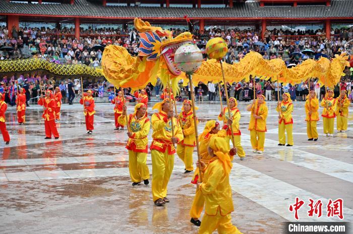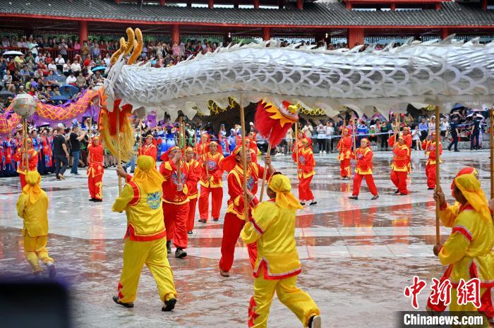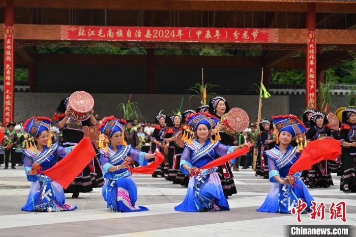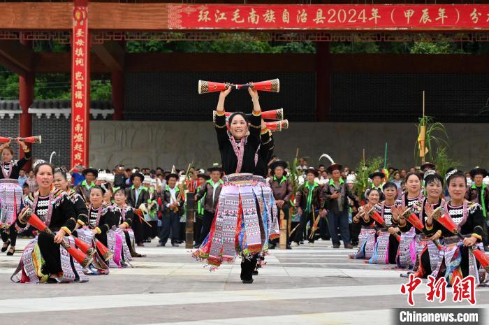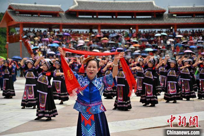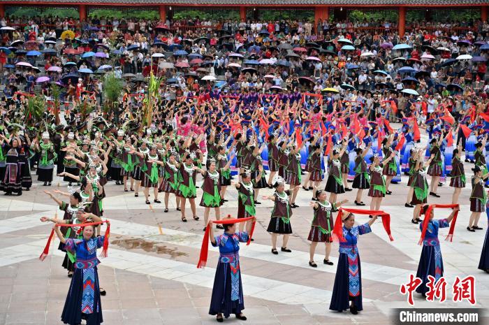 6月21日,中国唯一的毛南族自治县——广西河池市环江毛南族自治县举办传统民族节日“分龙节”。游人欢聚一堂,体验中国毛南族独具特色的民俗文化盛宴。图为民俗表演。 中新社记者俞靖摄