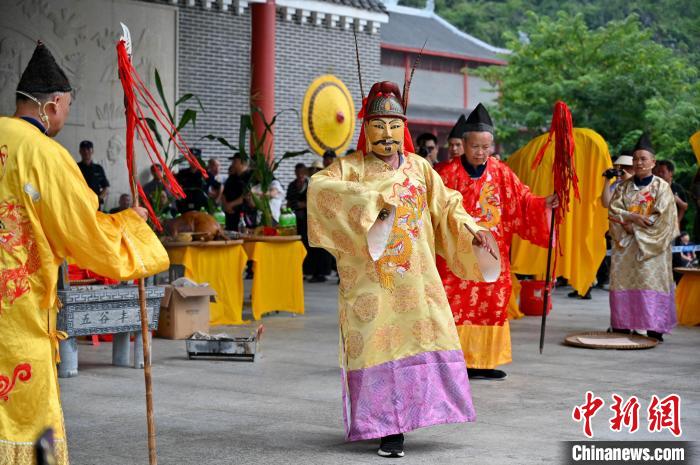6月21日,中国唯一的毛南族自治县——广西河池市环江毛南族自治县举办传统民族节日“分龙节”。游人欢聚一堂,体验中国毛南族独具特色的民俗文化盛宴。图为分龙节祈福仪式。 中新社记者俞靖摄