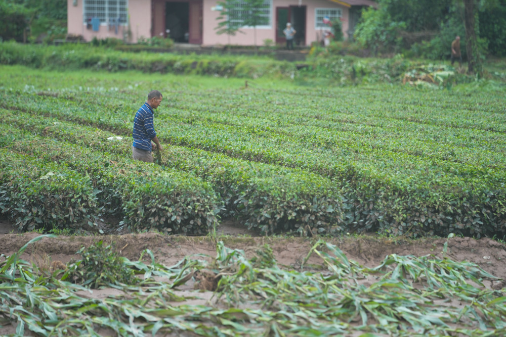 6月23日,茶庵铺镇尚寺坪村村民在清理受灾茶田。新华社记者 薛宇舸 摄