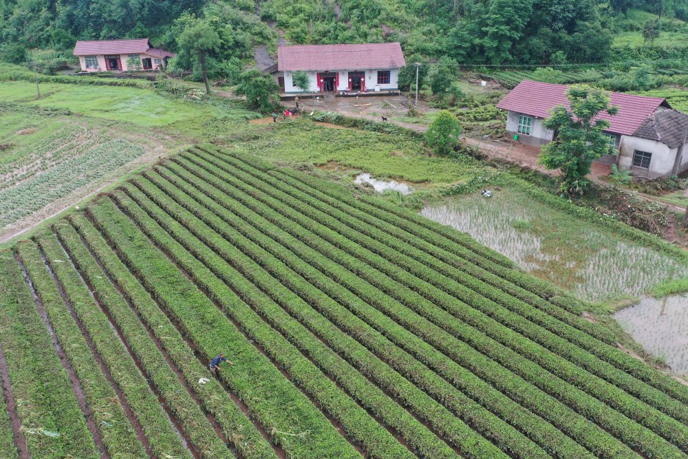 6月23日,茶庵铺镇尚寺坪村村民在清理受灾茶田(无人机照片)。新华社记者 薛宇舸 摄