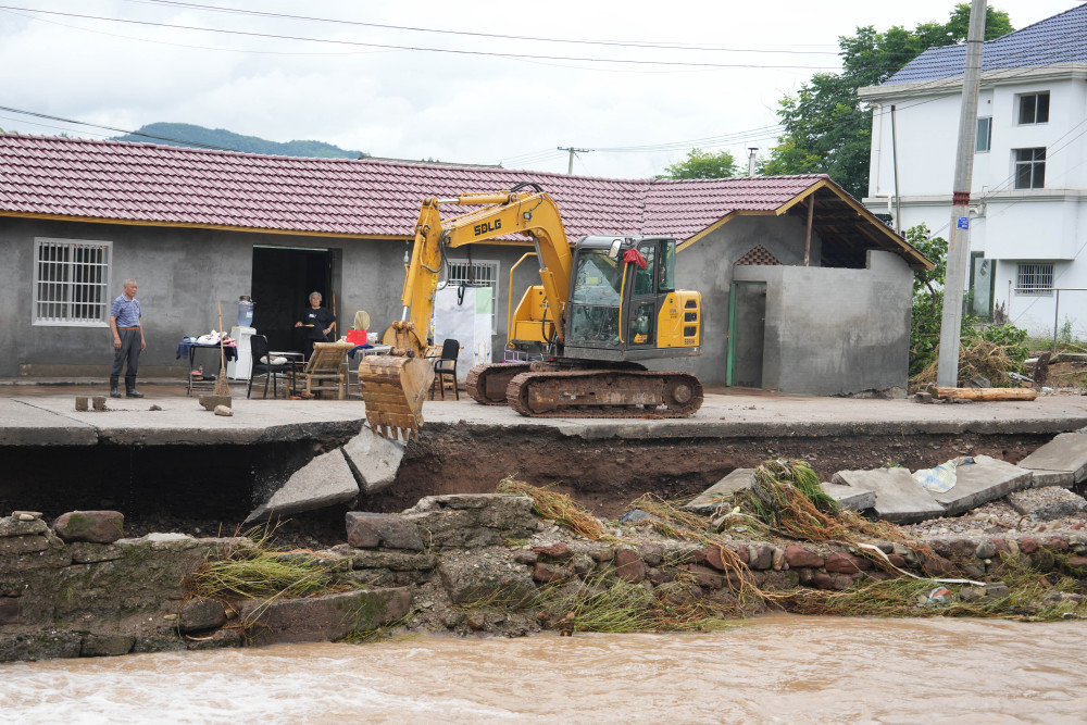 6月23日,在茶庵寺镇三元潭村,挖掘机在处理路基被洪水冲垮的村道。新华社记者 薛宇舸 摄