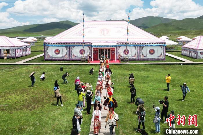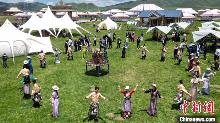 6月26日,在甘肃甘南藏族自治州碌曲县尕秀村帐篷城景区内,藏族民众通过载歌载舞,表演藏装秀来迎接远方来的客人。尕秀村的帐篷城由108顶大小各异的藏式风格帐篷组成。图为藏装秀表演现场。(无人机照片) 中新社记者九美旦增摄