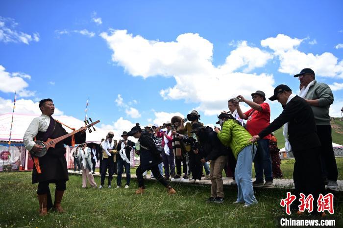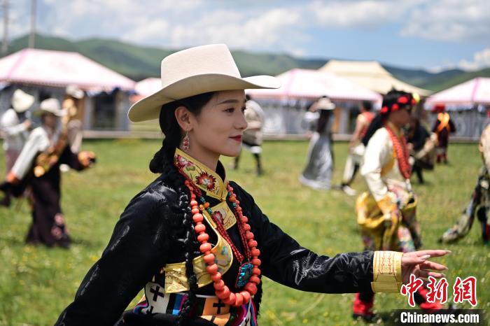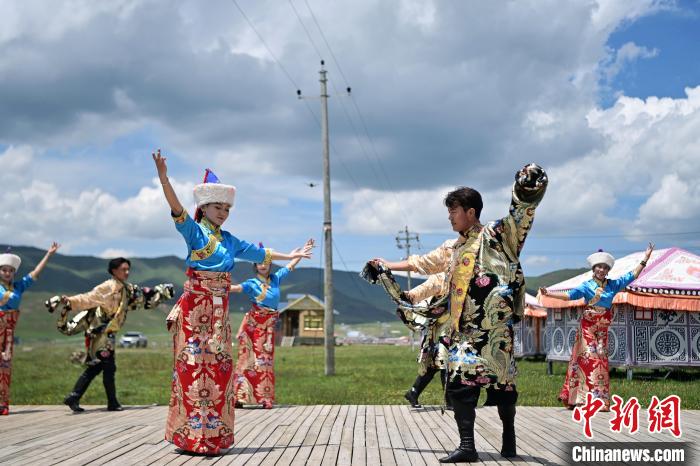6月26日,在甘肃甘南藏族自治州碌曲县尕秀村帐篷城景区内,藏族民众通过载歌载舞,表演藏装秀来迎接远方来的客人。尕秀村的帐篷城由108顶大小各异的藏式风格帐篷组成。图为藏族拉伊(山歌)表演。 中新社记者九美旦增摄