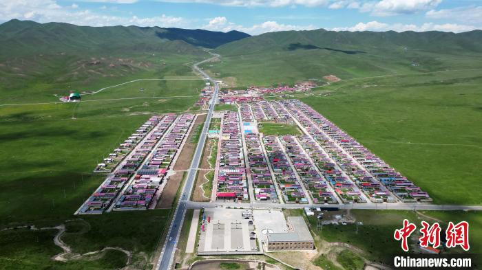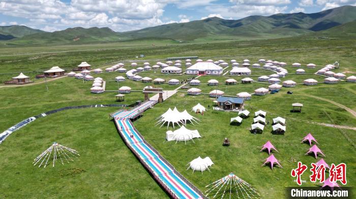 6月26日,在甘肃甘南藏族自治州碌曲县尕秀村帐篷城景区内,藏族民众通过载歌载舞,表演藏装秀来迎接远方来的客人。尕秀村的帐篷城由108顶大小各异的藏式风格帐篷组成。图为尕秀村村貌。(无人机照片) 中新社记者九美旦增摄