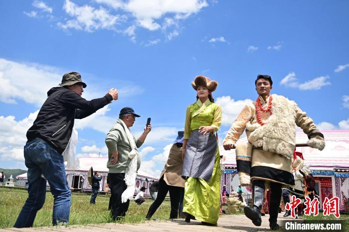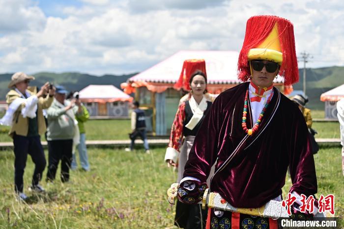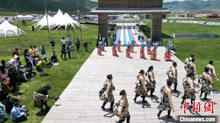 6月26日,在甘肃甘南藏族自治州碌曲县尕秀村帐篷城景区内,藏族民众通过载歌载舞,表演藏装秀来迎接远方来的客人。尕秀村的帐篷城由108顶大小各异的藏式风格帐篷组成。图为藏装秀表演现场。 中新社记者九美旦增摄