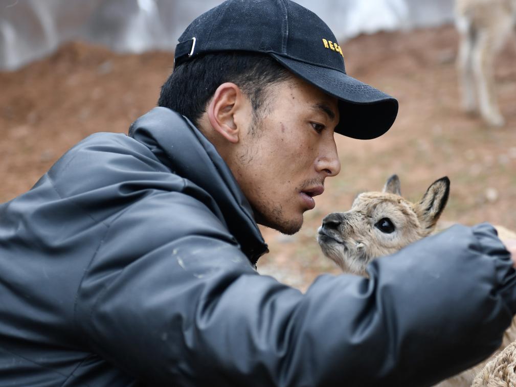 2020年7月7日,在可可西里卓乃湖保护站,保护队员才文多杰照顾一只藏羚羊幼仔。新华社记者张龙摄