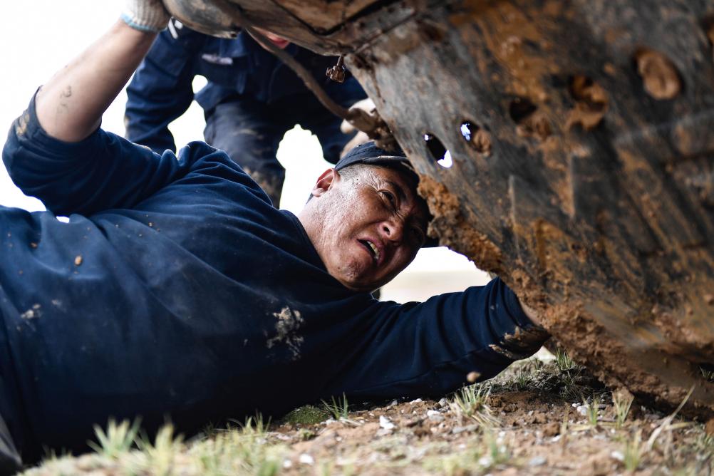 2020年7月6日,卓乃湖保护站站长秋培扎西在可可西里地区修理车辆。新华社记者张龙摄