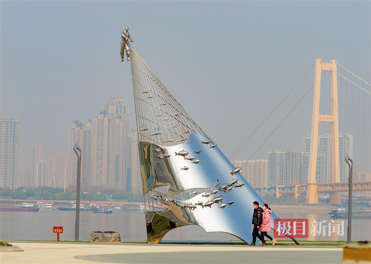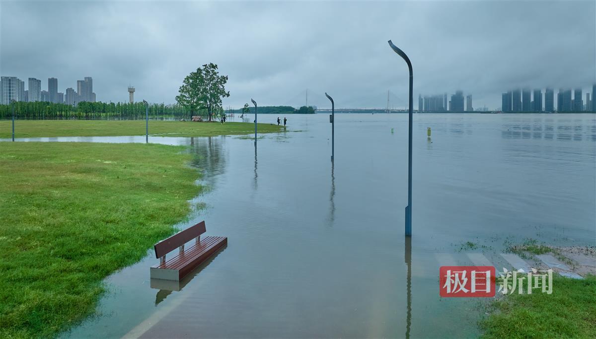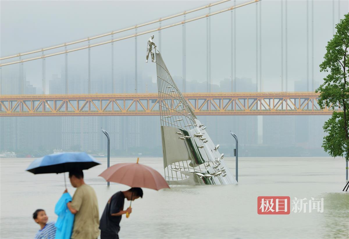 当日,极目新闻记者在武汉洪山江滩看到,沿江的低级亲水平台及树木已没入水中。大型不锈钢雕塑作品《渔乐》底座及以上1米已没入江水中,与记者在冬季枯水期拍摄的图片形成鲜明对比。