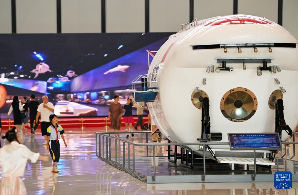 6月28日,小朋友在国家海洋博物馆内参观“蛟龙号”模型。