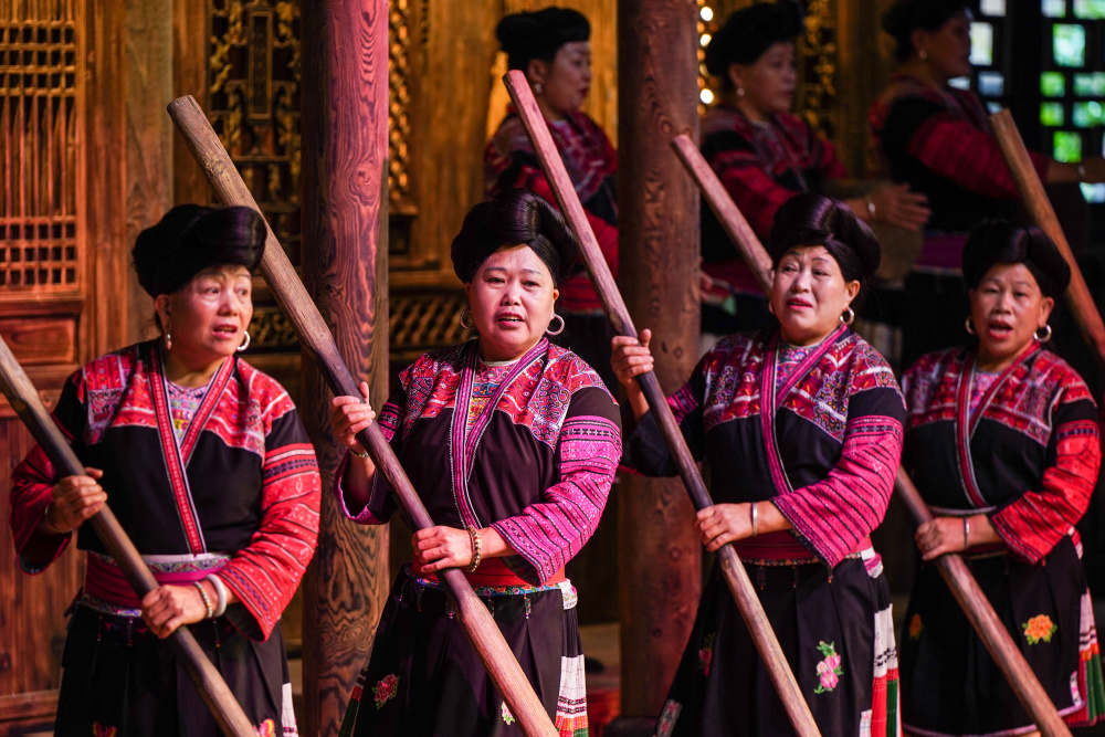 黄洛瑶寨村民演员在进行红瑶民俗文化表演(6月26日摄)。新华社记者 李博 摄