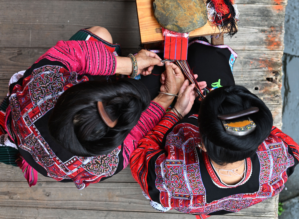 在黄洛瑶寨,国家级非遗瑶族服饰代表性传承人潘继凤(左)指导学徒编腰带(6月26日摄)。新华社记者 金皓原 摄