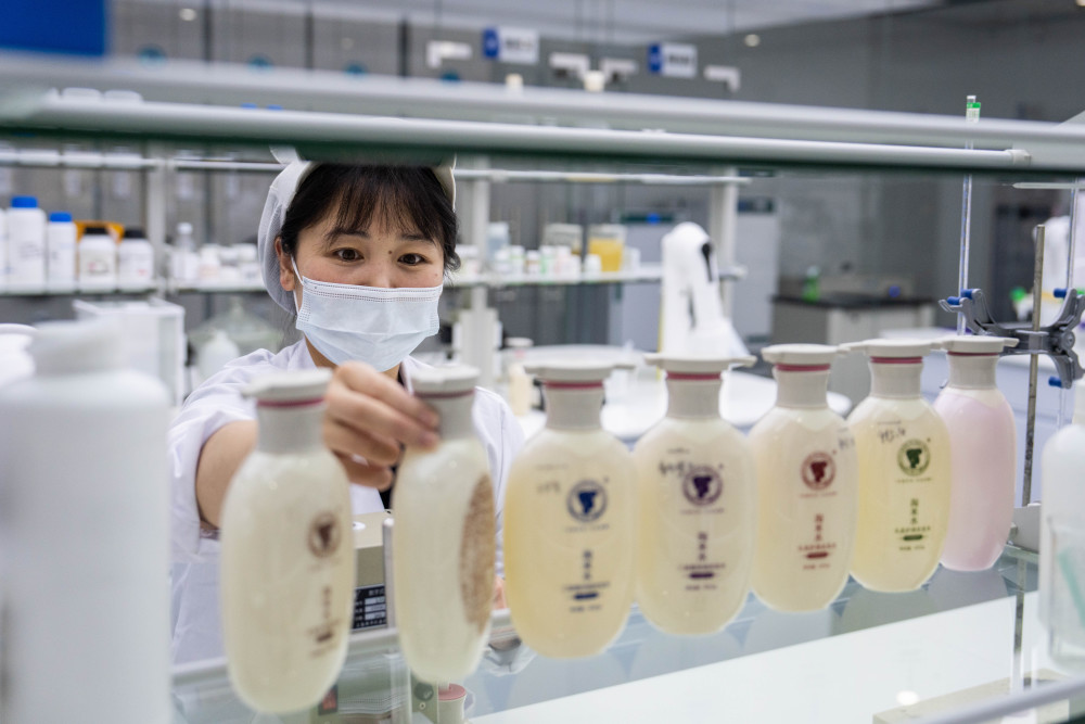 在位于黄洛瑶寨的桂林长发小寨生物科技有限公司实验室,工作人员拿取洗发水产品(6月26日摄)。新华社记者 杨植森 摄
