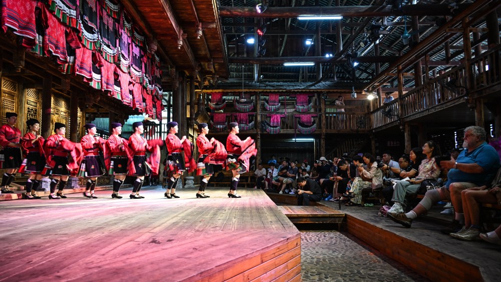 游客在黄洛瑶寨观看红瑶民俗文化表演(6月26日摄)。新华社记者 张爱林 摄