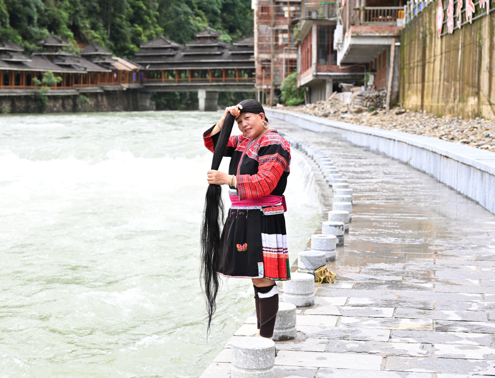 黄洛瑶寨村民潘秀香在金江河畔梳洗长发(6月26日摄)。新华社记者 金皓原 摄