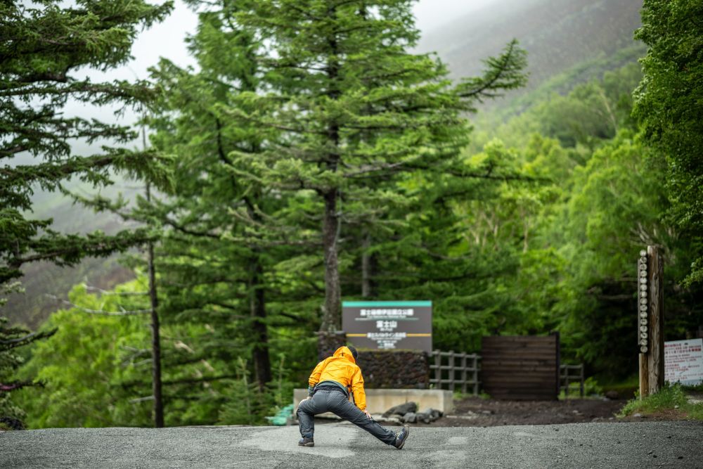 7月1日,在日本山梨县境内的富士山吉田路线,一名工作人员在登山大门处拉伸锻炼。新华社/法新