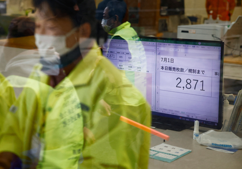 7月1日,在日本山梨县境内的富士山吉田路线,管理站的电脑屏幕显示登山人数。新华社/路透