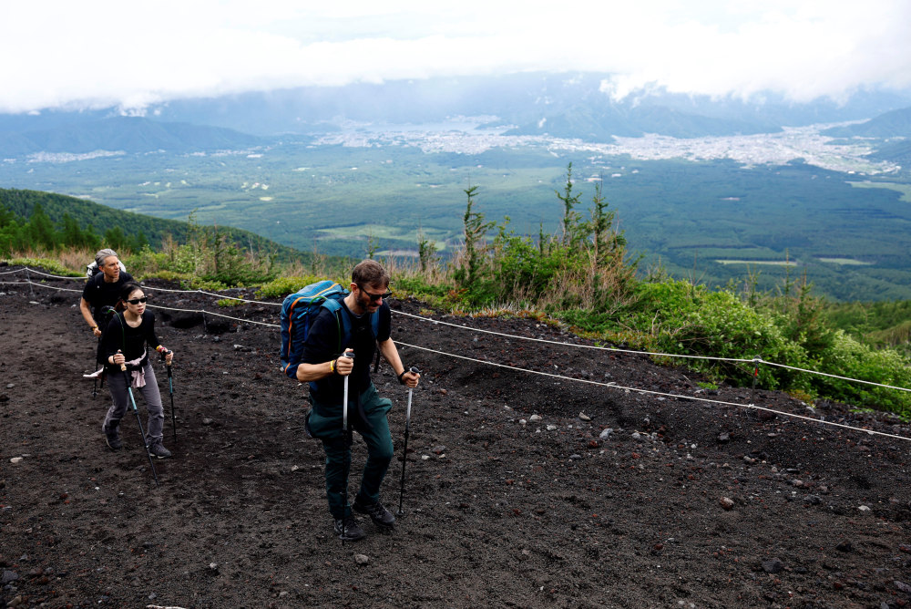 7月1日,在日本山梨县,游客走吉田路线登富士山。新华社/路透