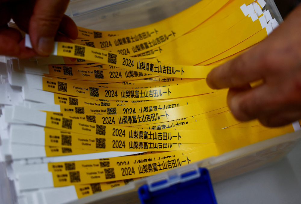 7月1日,在日本山梨县境内的富士山吉田路线,工作人员整理象征已支付登山通行费的腕带。新华社/路透