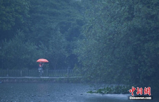 7月1日,西湖花港观鱼附近十分静美。当日,浙江杭州西湖在清晨时分云雾飘渺,蓝调时刻的景象如同江南烟雨水墨画,美不胜收。