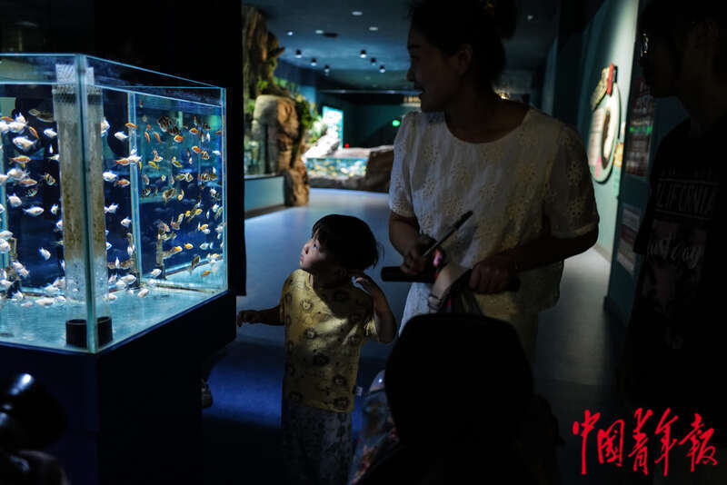 7月1日,江西省九江市湖口县,一名小朋友和家长在长江鄱阳湖水生生物保护中心参观。随着暑假的到来,这里成为了许多家庭寓教于乐的选择。 据介绍,这里是目前国内第一家综合性的淡水鱼科普馆。场馆内分设长江水系综述区、鄱阳湖区、淡水展缸区、湖口核心区、大水体区、淡水雨林及萌宠区、海洋区和表演场等八大展区。中青报·中青网记者 赵迪/摄