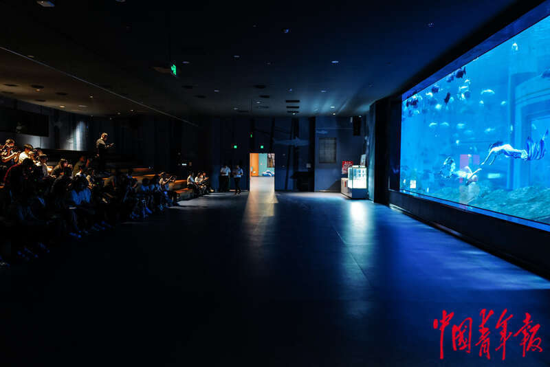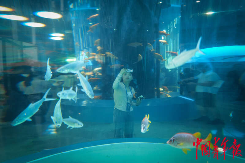 7月1日,江西省九江市湖口县长江鄱阳湖水生生物保护中心,参观者在欣赏水下表演。中青报·中青网记者 赵迪/摄