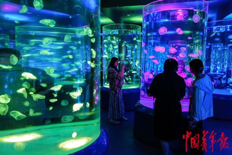 7月1日,江西省九江市湖口县,长江鄱阳湖水生生物保护中心,几位女士在观赏水母。中青报·中青网记者 赵迪/摄