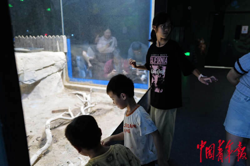 7月1日,江西省九江市湖口县,长江鄱阳湖水生生物保护中心,两名小朋友在观赏陆地生物展示。中青报·中青网记者 赵迪/摄