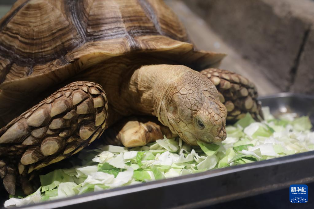 7月1日,在长江鄱阳湖水生生物保护中心,一只苏卡达陆龟在进食。