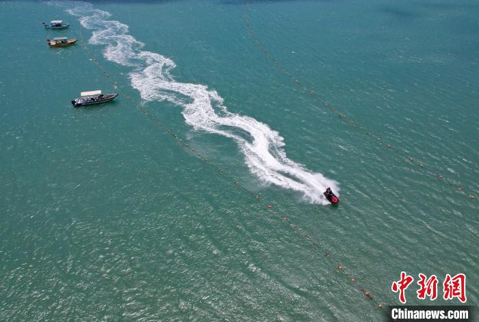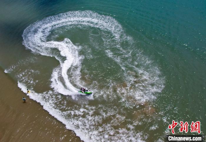 7月2日,夏日炎炎,福建省平潭综合实验区龙凤头海滨浴场吸引众多游客前来玩水避暑。图为游客驾驶水上摩托艇。(无人机照片)