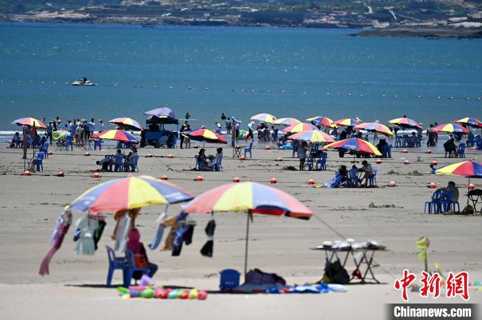 7月2日,夏日炎炎,福建省平潭综合实验区龙凤头海滨浴场吸引众多游客前来玩水避暑。图为游客在海边沙滩纳凉。