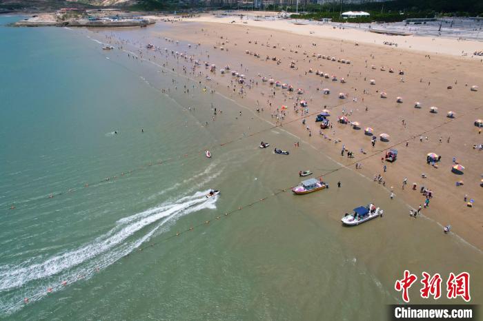 7月2日,夏日炎炎,福建省平潭综合实验区龙凤头海滨浴场吸引众多游客前来玩水避暑。(无人机照片)