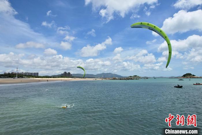 7月2日,夏日炎炎,福建省平潭综合实验区龙凤头海滨浴场吸引众多游客前来玩水避暑。图为游客海上玩风筝板。(无人机照片)