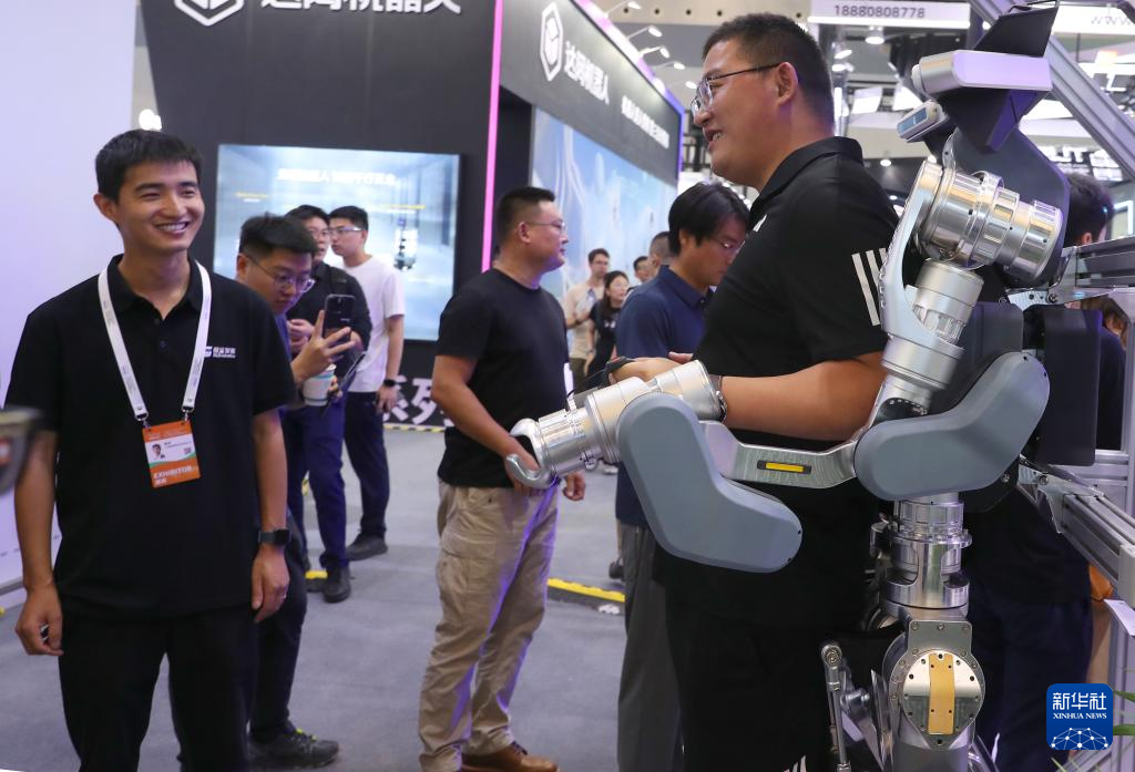 7月4日,参观者(右)在展会现场体验一款重型外骨骼设备。
